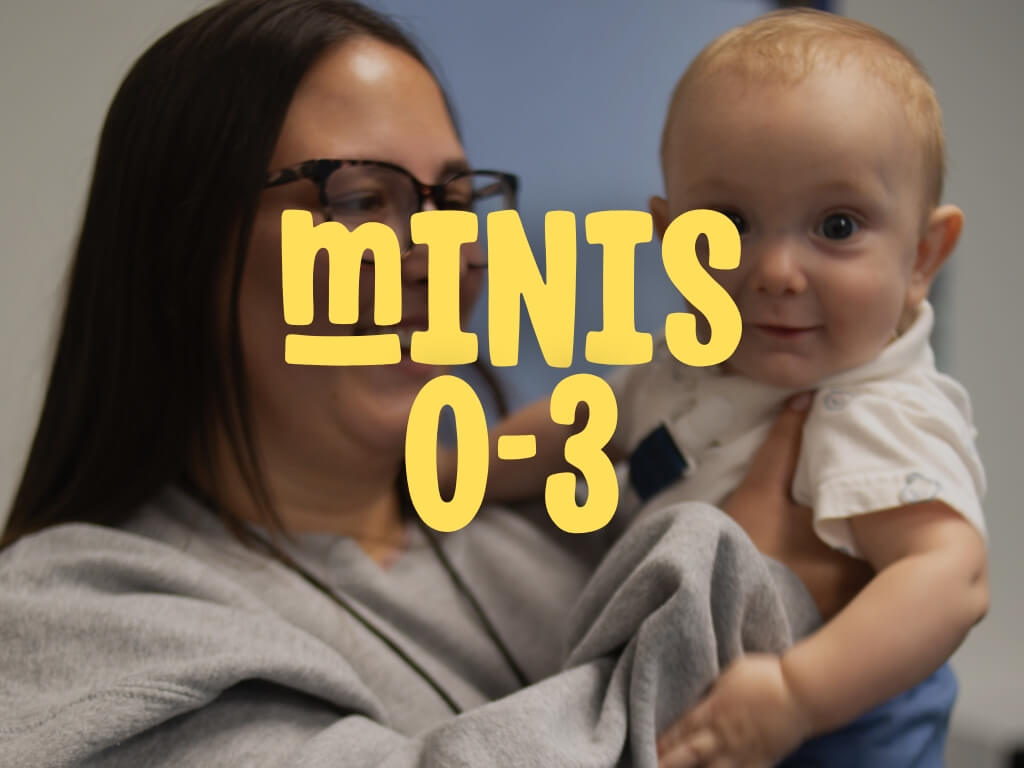 Minis is designed just for babies and toddlers, ages 0 to 3. In a safe and nurturing space, our trained team creates a loving environment where your child can begin to experience God’s love through songs, play, and care. Every volunteer is background-checked and focused on your child’s well-being.